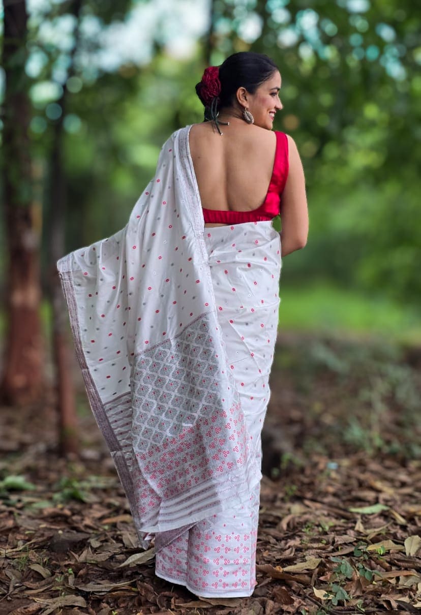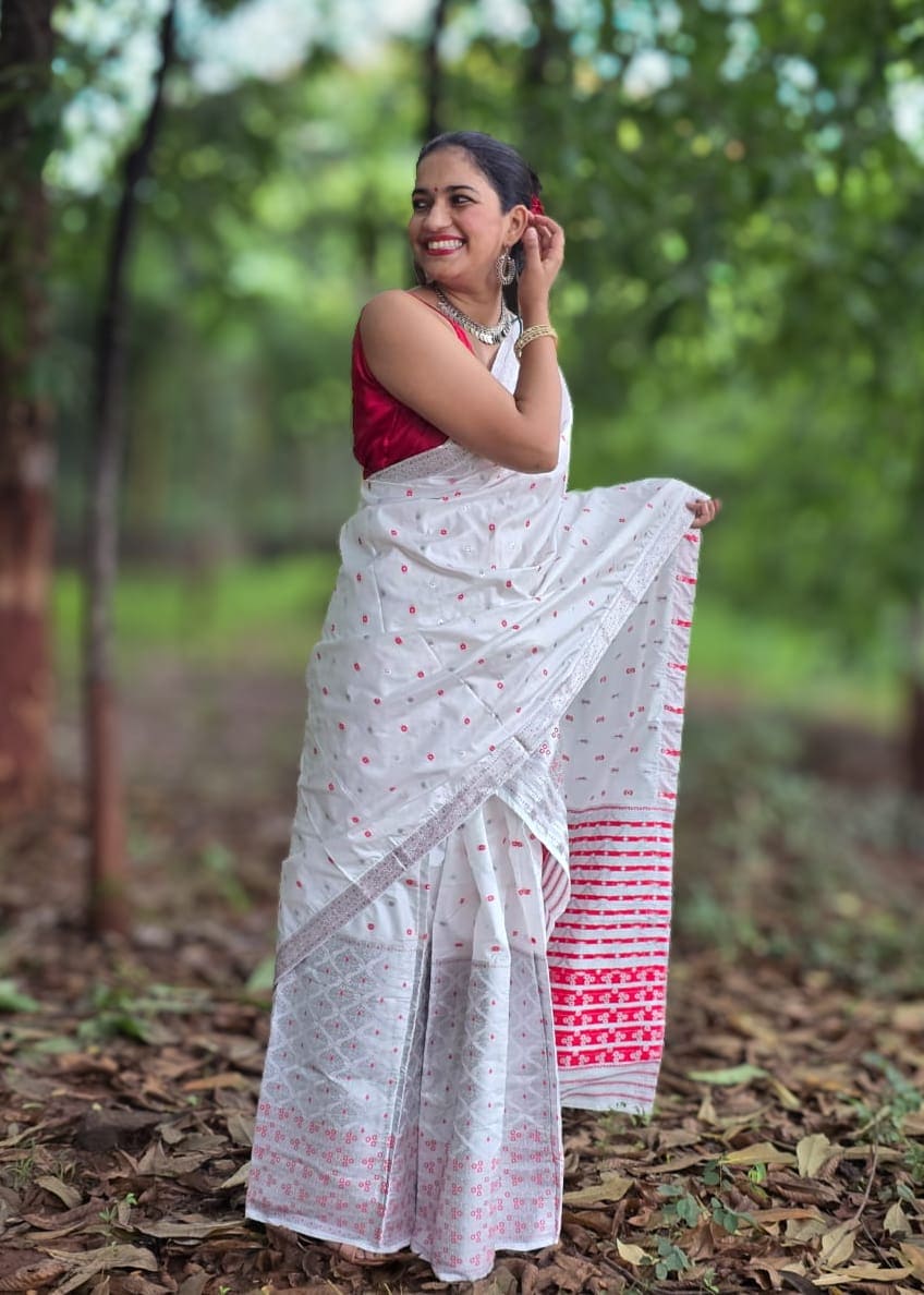 White Mixed Silk Mekhela Chador with Red Motifs from Assam